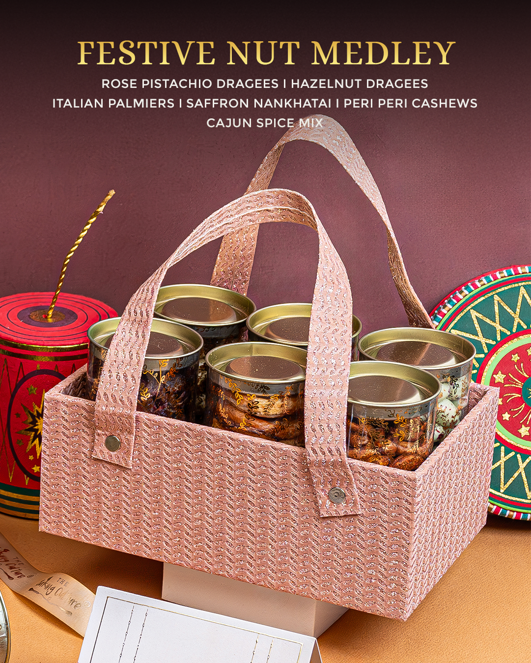 A vibrant basket of six gourmet treats including nuts, dragees, and cookies. Packed with festive flavors, it makes for a cheerful and thoughtful Diwali gift.