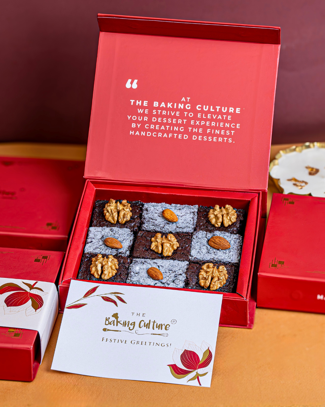 Fudgy and decadent, these handcrafted brownies come in almond and walnut variants, blending rich chocolate with a satisfying nutty crunch. Encased in a premium red box with a custom sleeve and an optional festive greeting card, they make for a thoughtful and indulgent gift.